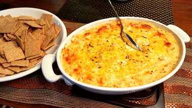 Place the crab dip into an oven save serving dish and sprinkle the reserved cheddar cheese across the top. Cover dish with aluminum foil and into the oven for 15-20 minutes. Remove the foil and continue baking until the cheese starts to turn a light golden brown and dip is bubbling. Remove from the oven and let cool for a few minutes then serve with crackers.